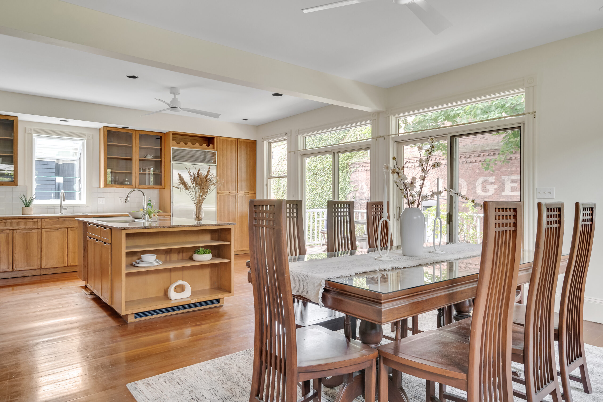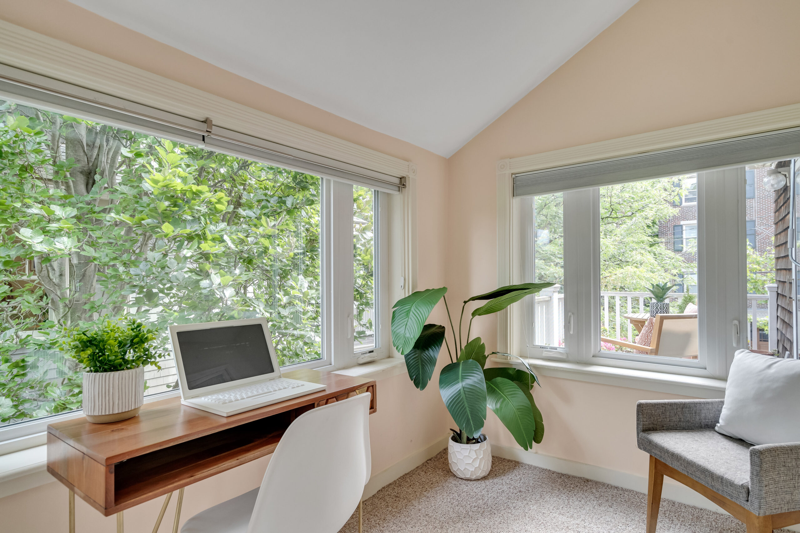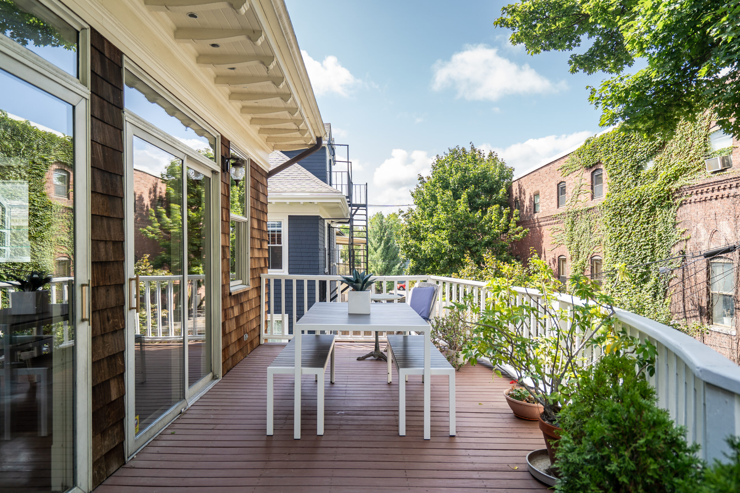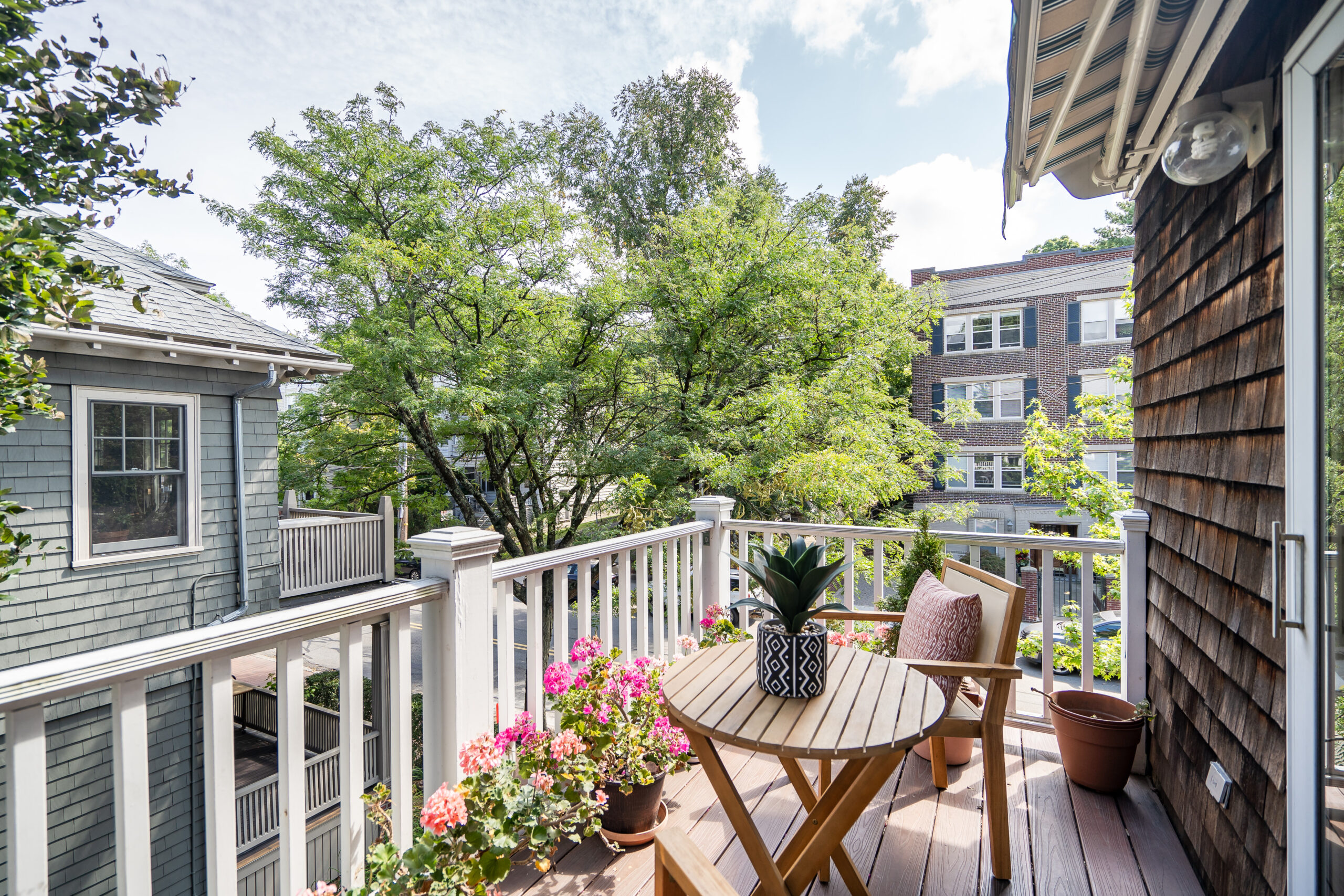 A rare beauty! The luscious light-flooded interior with oversized rooms and several flex rooms provides multiple options for your use. The large, comfortably elegant living room has a fireplace and off the living room is a flex room with a private balcony. The kitchen is for gathering with family and friends; has abundant wood cabinetry, a big, well-used Garland range with double oven, a Sub-Zero refrigerator, 2 sinks and an island. A wall of windows and sliders opens to the deck with its private views. Two offices, a laundry closet and half bath complete this floor. The primary bedroom is awesome, with its vaulted ceilings, size, skylights and window seat, plus a walk-in closet and lovely marble bathroom. 2 additional bedrooms share the 2nd full bath. Stairs from the deck lead to the wondrously-sized private fenced yard; there is plentiful basement storage; and 2 tandem parking. Terrifically located near the Porter Square T, commuter rail, Raymond Park and so many restaurants and shops.